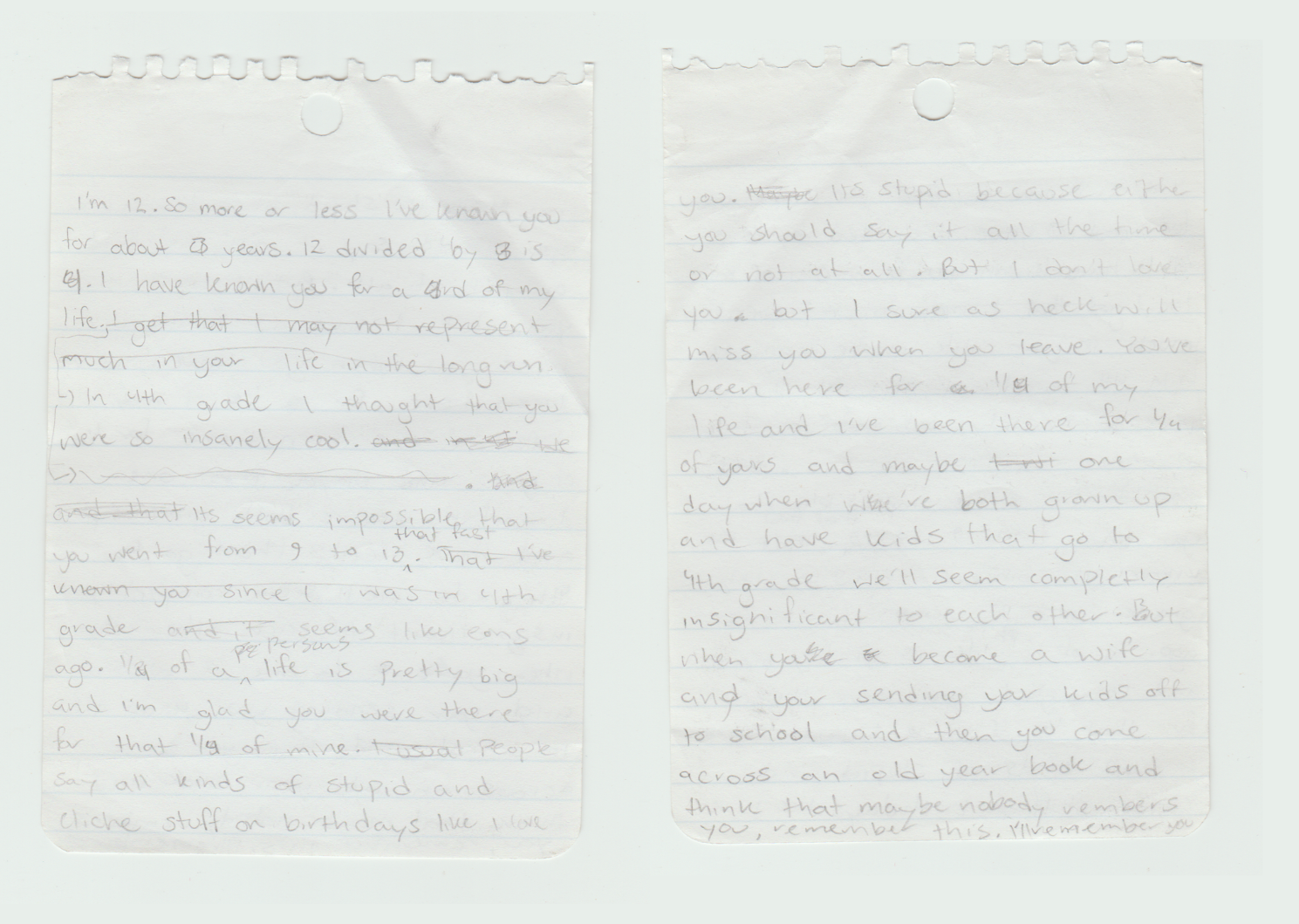 People say all kinds of stupid and cliche stuff on birthdays like “I love you”. It’s stupid because either you should say it all the time or not at all. But I don’t love you. But I sure as heck will miss you when you leave. You’ve been here for a quarter of my life and I’ve been here for a quarter of yours and maybe when we’re both grown up and have kids that go to fourth grade we’ll seem completely insignificant to each other. But when you become a wife and you’re sending your kids off to school and then you come across an old yearbook and think that maybe nobody remembers you, remember this: I’ll remember you.